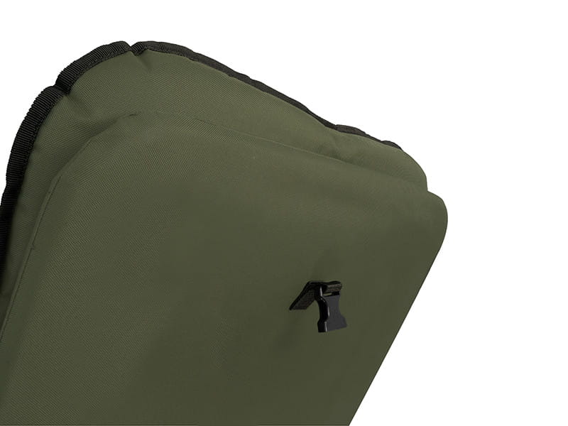 Regulowany mechanizm umieszczony w podłokietnikach fotela pozwala na zmianę kąta oparcia w zależności od potrzeb wędkarza. Maksymalny komfort dla głowy i szyi zapewnia dodatkowo wyściełana część polarowa w ciemnozielonym kolorze, na której znajduje się logo produktu. Materac w obszarze pleców i siedziska wykonany jest z wytrzymałej tkaniny 600D z unikalnymi ukośnymi szwami. Krawędzie pokryte są tkaniną 600D z opatentowanym kamuflażem C2G. Aby umilić czas pomiędzy połowami, krzesło wyposażone jest w ergonomicznie wyprofilowane podłokietniki zapewniające doskonały komfort podczas odpoczynku i obserwacji otaczającej przyrody.