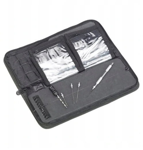 Wyposażony w krótką i długą tablicę na przypony organizer posiada także 8 przezroczystych kieszonek na drobiazgi, takie jak gotowe przypony, plecionki czy inne akcesoria. Na wyposażeniu znajdują się szpilki do mocowania gotowych zestawów. Wewnątrz znajduje się 8 elastycznych gumowych opasek na igły, wiertła. Materiał 600 x 450D z wodoodporną powłoką PVC. Na wyposażeniu etui nie ma widocznych na zdjęciu igieł.