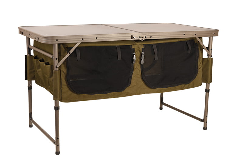 - Rozwiązanie 2-w-1 na dłuższe zasiadki, które łączy w sobie duży stół z miejscem do przechowywania pod spodem